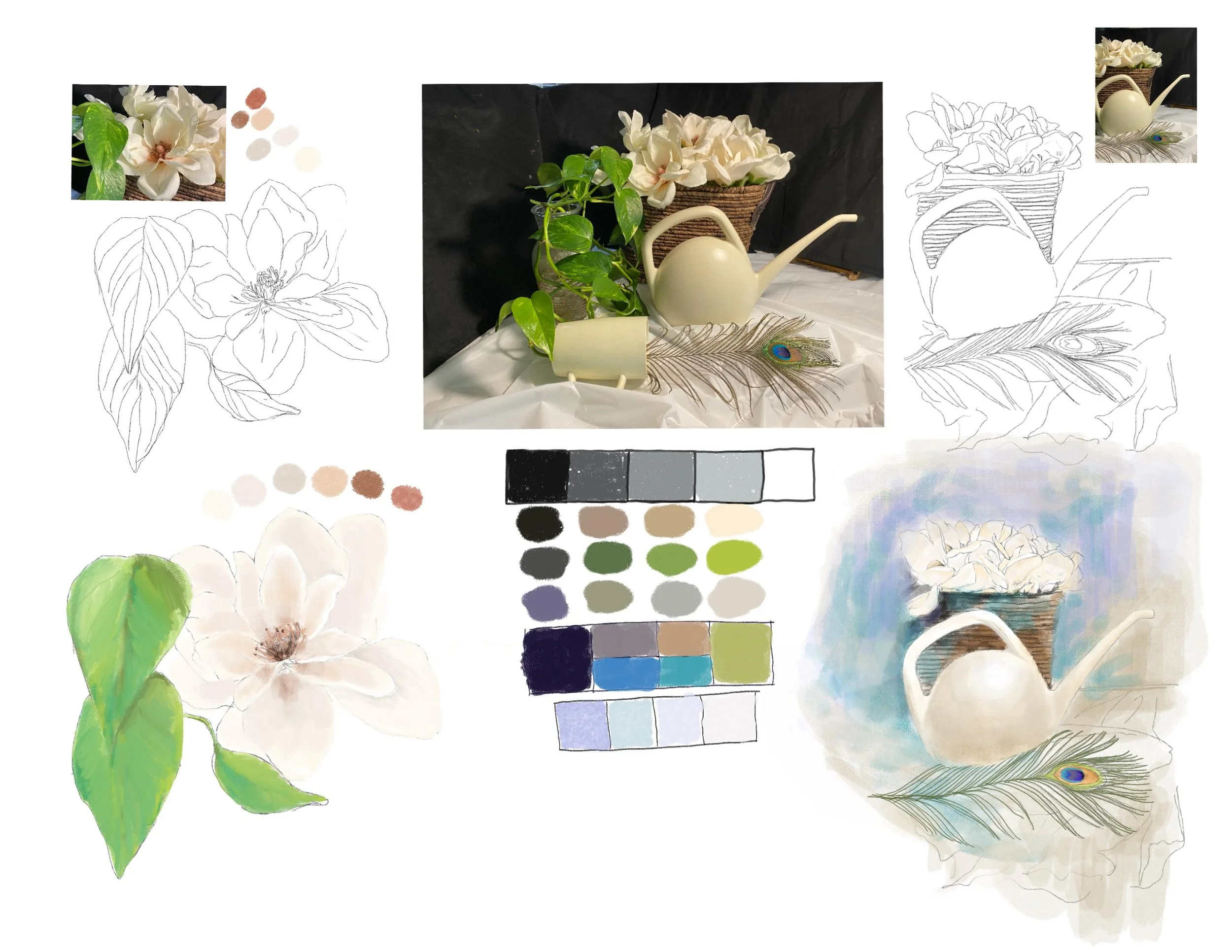 In Class: The still life is set up in the private lesson room at the studio. Please take advantage of the opportunity this week before we dismantle the still life. Take pics, study live or take video…or all of the above!